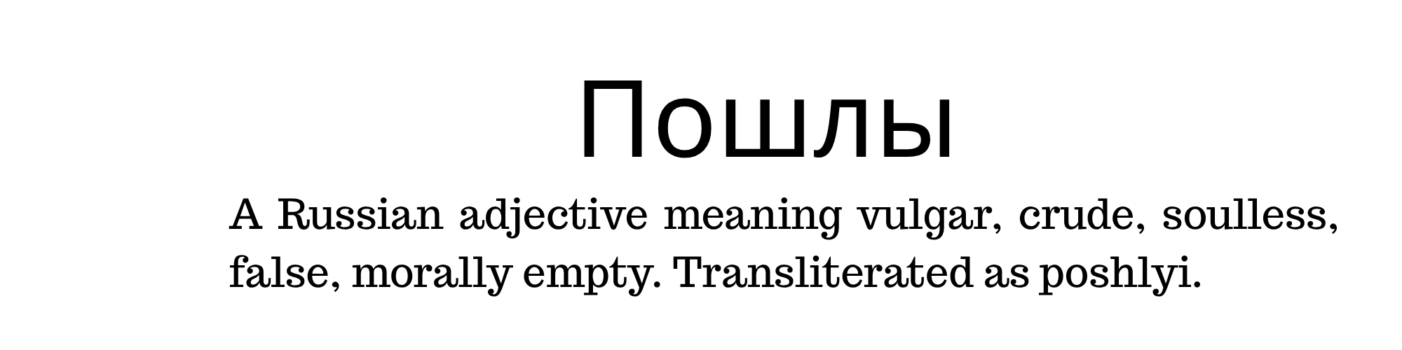 But poshlyi and its noun form–пошлость , or poshlost–have so many nuanced resonances that they have a sort of cult following. Many writers have penned essays on these two words, in part because in 1944 the great Vladimir Nabokov meditated at length on poshlost, saying that it is “not only the obviously trashy but also the falsely important, the falsely beautiful, the falsely clever, the falsely attractive. By describing something as 'poshlost', we pass not only an aesthetic but also a moral judgment. Everything that is true, honest, beautiful cannot be described as poshlost."